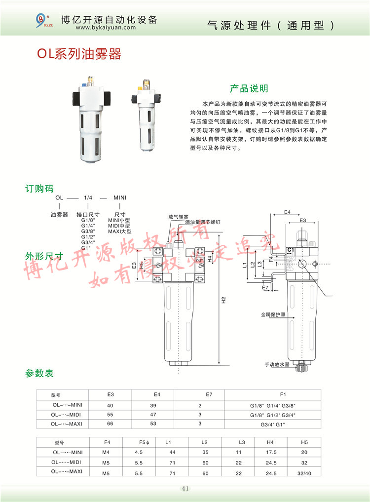 OL系列油霧器加油器,也有客戶稱之為OF油杯,其主要的尺寸由G1/8到G1寸之間,新款的調(diào)節(jié)器保證了油霧量和空氣的比例,更多的技術(shù)咨詢請聯(lián)系本公司技術(shù)部:0371-85612788。