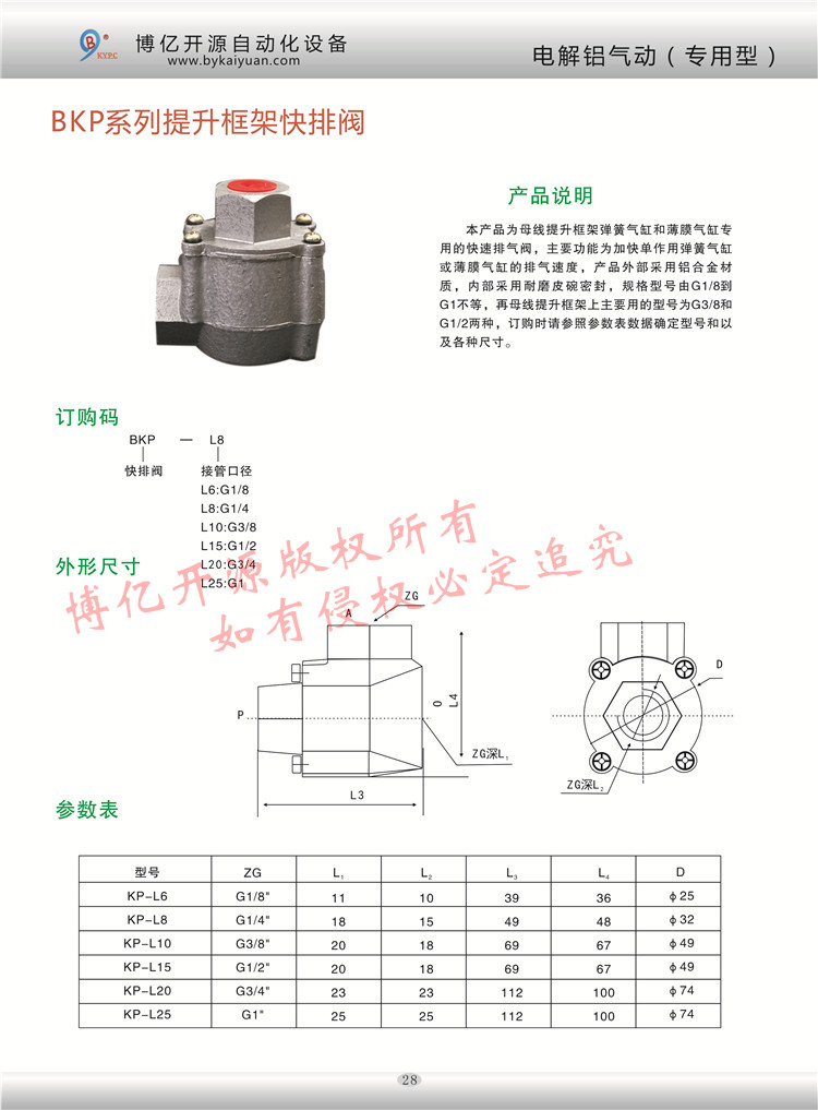 型號(hào)BKP-L10和BKP-L15的氣動(dòng)快速排氣閥,其外觀構(gòu)造與廣東肇慶方大氣動(dòng)一模一樣,主要用于電解鋁行業(yè)母線提升框架彈簧氣缸的排氣系統(tǒng),更多的技術(shù)咨詢請(qǐng)聯(lián)系本公司技術(shù)部:0371-85612788。