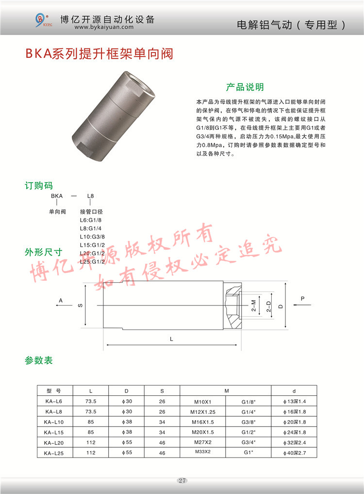 型號(hào)BKA-L20和BKA-L25的氣動(dòng)單向閥,由博億開源公司自主研發(fā),主要用于電解鋁行業(yè)母線提升框架的儲(chǔ)氣裝置,更多的技術(shù)咨詢請(qǐng)聯(lián)系本公司技術(shù)部:0371-85612788。