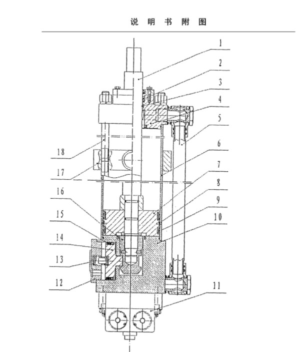 圖中,1-活塞桿;2-密封圈;3-支撐環(huán);4-前蓋;5-輸氣管;6-缸筒;7-活塞;8-支撐環(huán);9-密封圈;10-后蓋;11-氣控閥;12-小活塞壓蓋;13-彈簧;14-小活塞;15-密封圈;16-緩沖螺母;17-中擺軸;18-拉桿;