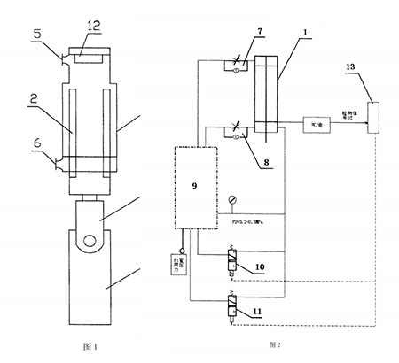 構(gòu)成:缸體1和裝在缸體1中的活塞軸2,缸體1的直徑為180mm;活塞軸2連接接頭3,接頭3連接打殼錘頭4;在缸體1的前缸蓋內(nèi)壁上裝有壓力傳感器,壓力傳感器通過導(dǎo)線與槽控機(jī)13相連;在缸體1的上部設(shè)有上進(jìn)氣口5、下部設(shè)有下進(jìn)氣口6,上進(jìn)氣口5連接上進(jìn)氣閥7,下進(jìn)氣口6連接下進(jìn)氣閥8,上進(jìn)氣閥7和下進(jìn)氣閥8連接控制閥組9;控制閥組9與主控閥10和風(fēng)壓切換閥11相連接,主控閥10、風(fēng)壓切換閥11通過導(dǎo)線連接槽控機(jī)13。在缸體1的頂部裝有永磁材料制作而成的磁控制鎖12,用于在系統(tǒng)停風(fēng)時(shí)對(duì)活塞軸2進(jìn)行自鎖,防止打殼錘頭4下滑。在操控機(jī)13中設(shè)有一個(gè)紅色警示燈和一個(gè)綠色警示燈,用于警示打殼過程中的開始和結(jié)束。