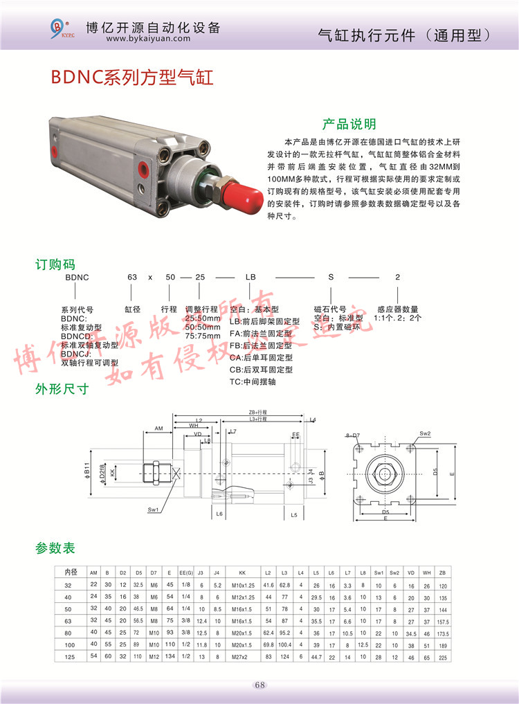 BDNC系列方型氣缸是博億開源自主研發(fā)的拉桿內(nèi)藏式式方型標(biāo)準(zhǔn)氣缸,氣缸直徑32-100,氣缸行程根據(jù)客戶選擇貨定制,氣缸可安裝帶磁感應(yīng)和各種安裝附件,更多的技術(shù)咨詢請(qǐng)聯(lián)系本公司技術(shù)部:0371-85612788